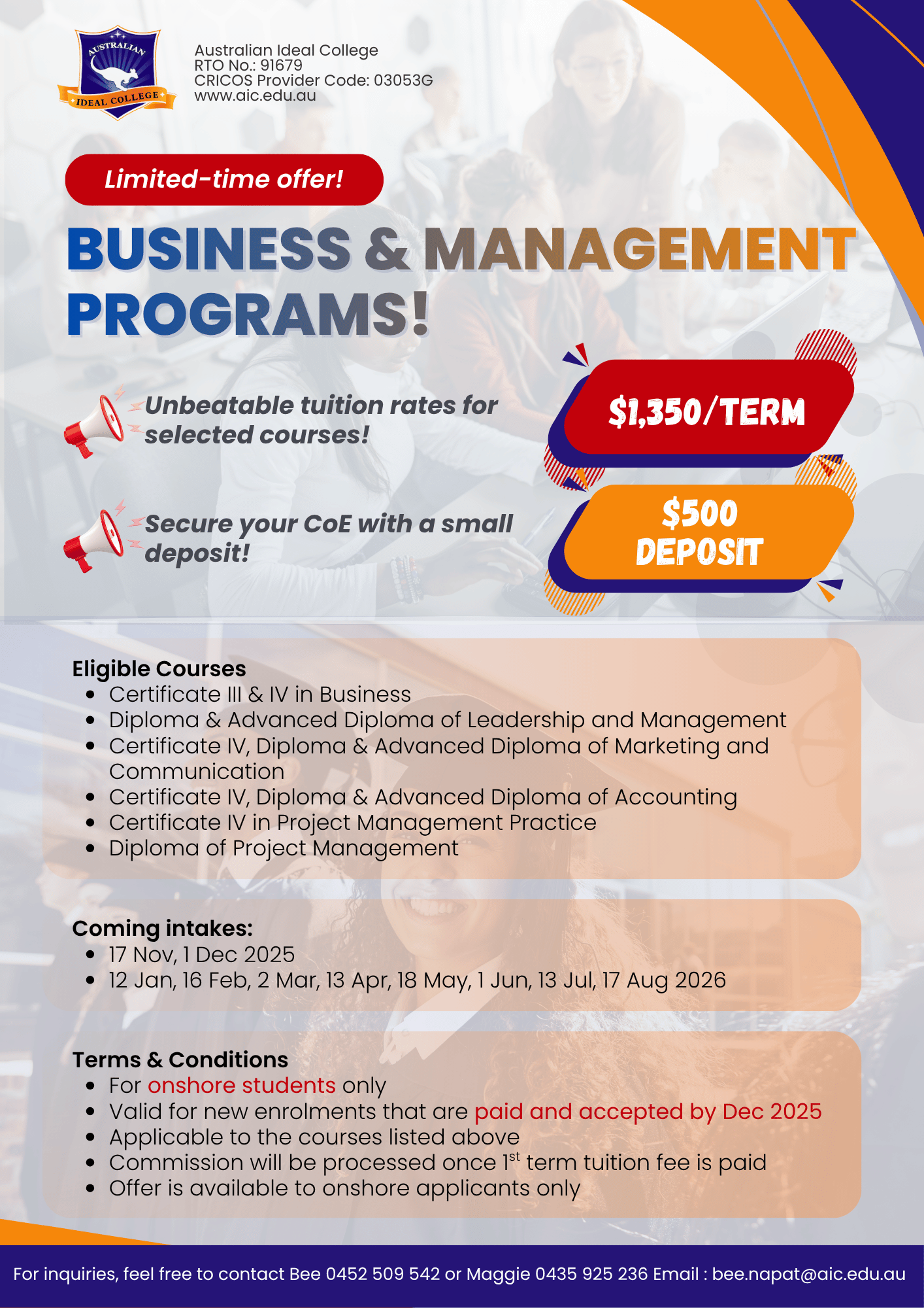 Australian ideal college details An international College that is offering in Sydney, Adelaide and Hobart.Offering various courses ranging from GE, Leadership and management, Accounting, Business and Interpreting & Translating courses. For more information www.aic.edu.au All Forms List Agent Application Form AIC Application Form (Nov 2024) AIC Registration Form Sydney-NAATI Busi GE Course Variation Request Form Credit Transfer and RPL form Declaration Form Document request form V 6.5 Refund-Request-Form Timetable Update Jun 2024 Student Special Leave Request Genuine Student Requirement form (GS) Under 18 Forms AIC Under 18 Student Agreement Guardian Homestay Inspection Sheet Parent Nomination for Guardian _ Homestay Form Pastoral Care agreement College & Course Information | Price list Hospitality Management Travel and Tourism Management Project Management Graduate Diploma of Management (Learning) Community Services Price list for Offshore-Onshore Sydney | Adelaide | Hobart 2025 Campus : Sydney | Adelaide | HobartAddress Sydney: Level 7 & 8, 75 King Street Sydney NSW 2000 AustraliaAddress Adelaide: Level 3, 7 James Place (cnr Rundle Mall) Adelaide SA 5000 AustraliaAddress Hobart: Ground floor, 114-116 Murray Street Hobart TAS 7000 AustraliaPhone: (+61)2 9262 2968 Mobile: 0424 469 542Email : [email protected] | [email protected] Website : www.aic.edu.au Video/Photo/Social Media Connect to AIC website Connect to AIC Facebook News 2025 Onshore Promotion 2025 Offshore Promotion