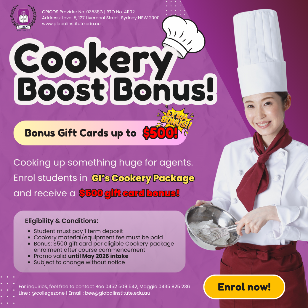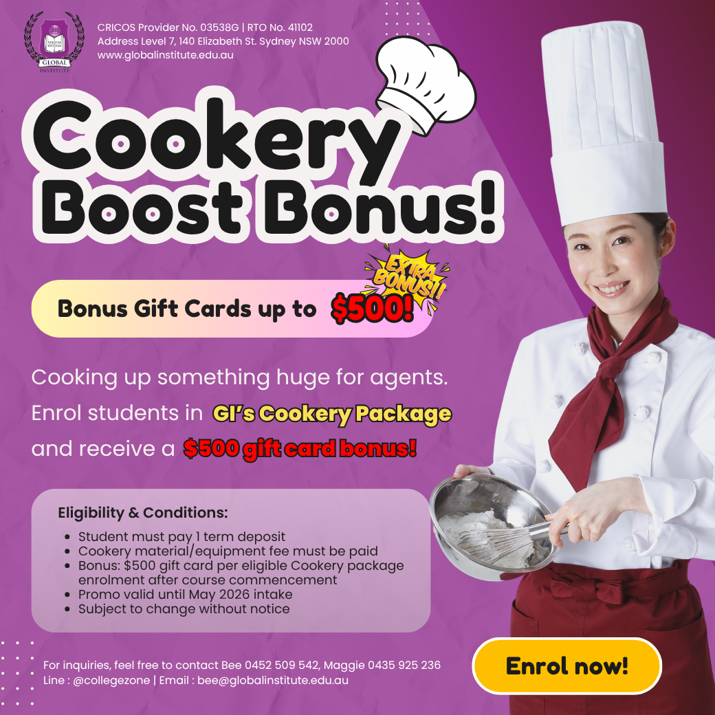 A dynamic vocational college located in Sydney’s CBD offering quality Commercial Cookery and hospitality with work placement provide up to 400 hours during study. Global Institute provided new facilities for Commercial Cookery and tons of resources online in student portal. Practicing kitchen class will be at Darlinghurst. We also own a nice and cosy café called “Jamie’s Kitchen” at the same venue as kitchen class. We also specialise in Hospitality range from Certificate IV, Diploma and Advanced Diploma of Hospitality.