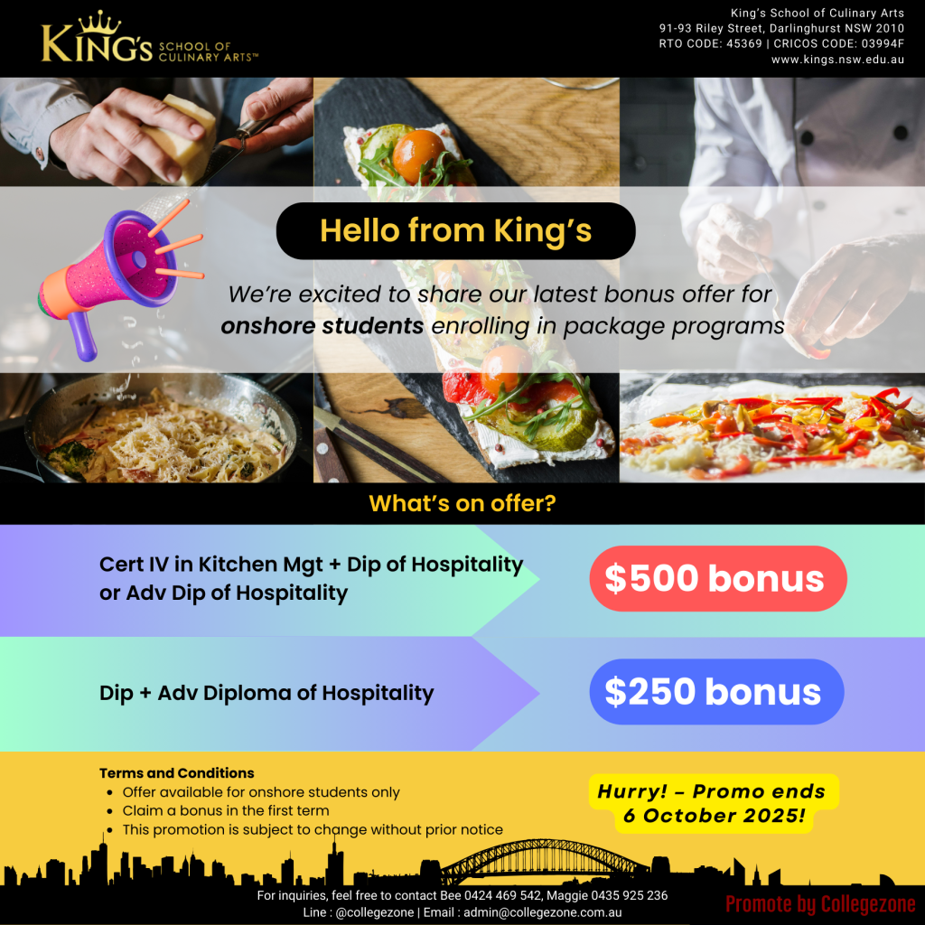 Our Vision Is To Be A Source Of Joy In Hospitality Industry For All People, Families, And Communities.Our school is dedicated to making Australia and the world better by means of outstanding education in all aspects of food and its related industries. Through our quality learning experience, King’s School of Culinary Arts prepares future food leaders, pioneers, and specialists for personal and professional achievement.