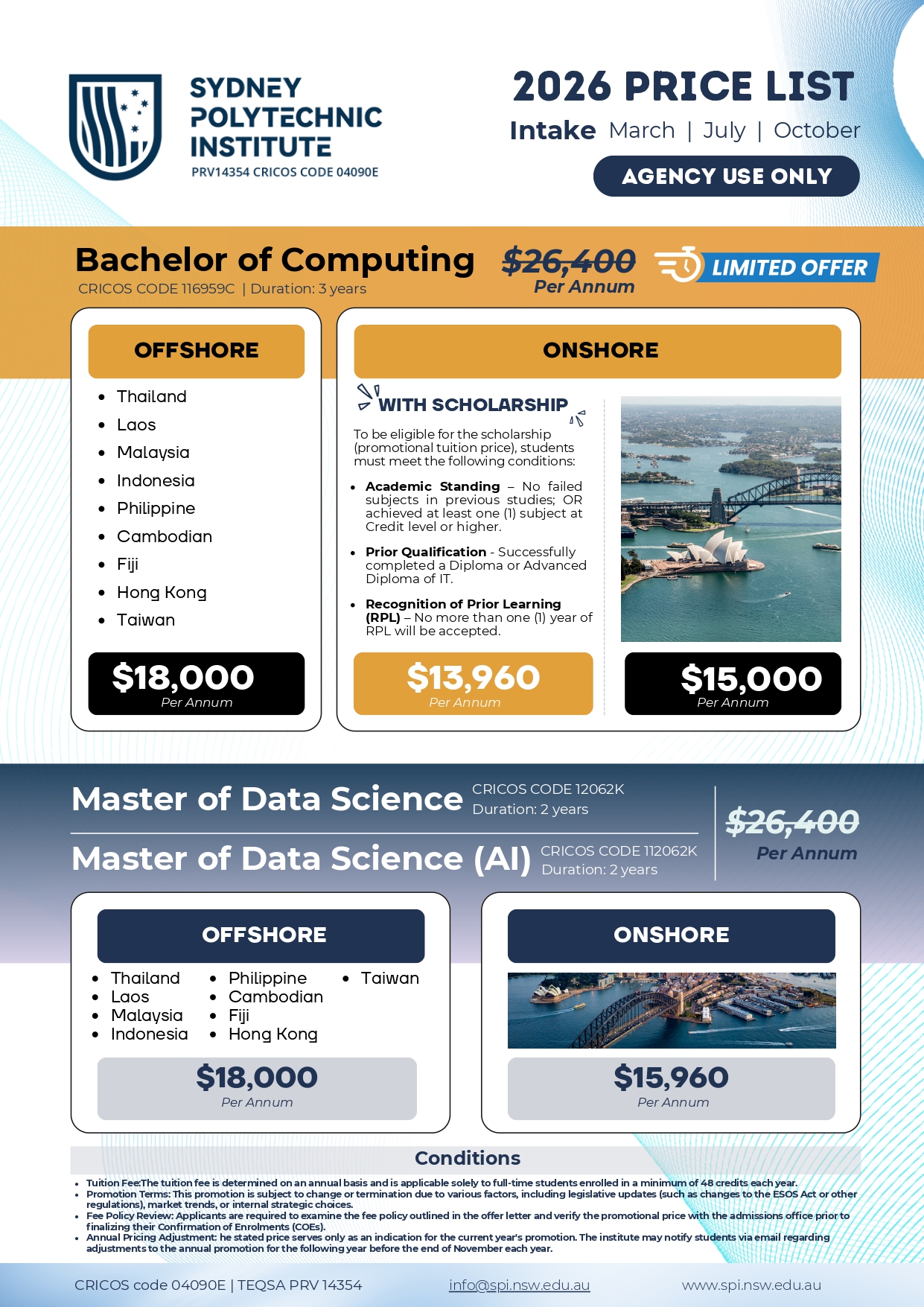 Sydney Polytechnic Institute (SPI) is a CRICOS-registered higher education provider based in Sydney, offering industry-focused programs in Data Science, Artificial Intelligence, Computing, and Business.